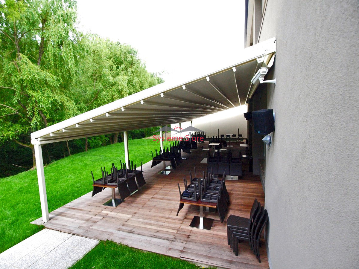 C’est un système avec une structure en aluminium fixée au mur avec un profil 150*92 mm comprenant des pieds fixés au sol. Le store à plis de pvc soutenu par des traverses de 43*65 mm en aluminium qui coulissent sur des coulisses latérales de 165*92 mm par le biais d’un système de transmission installé sur ces mêmes coulisses. Le mouvement du système peut être manuel ou automatisé.