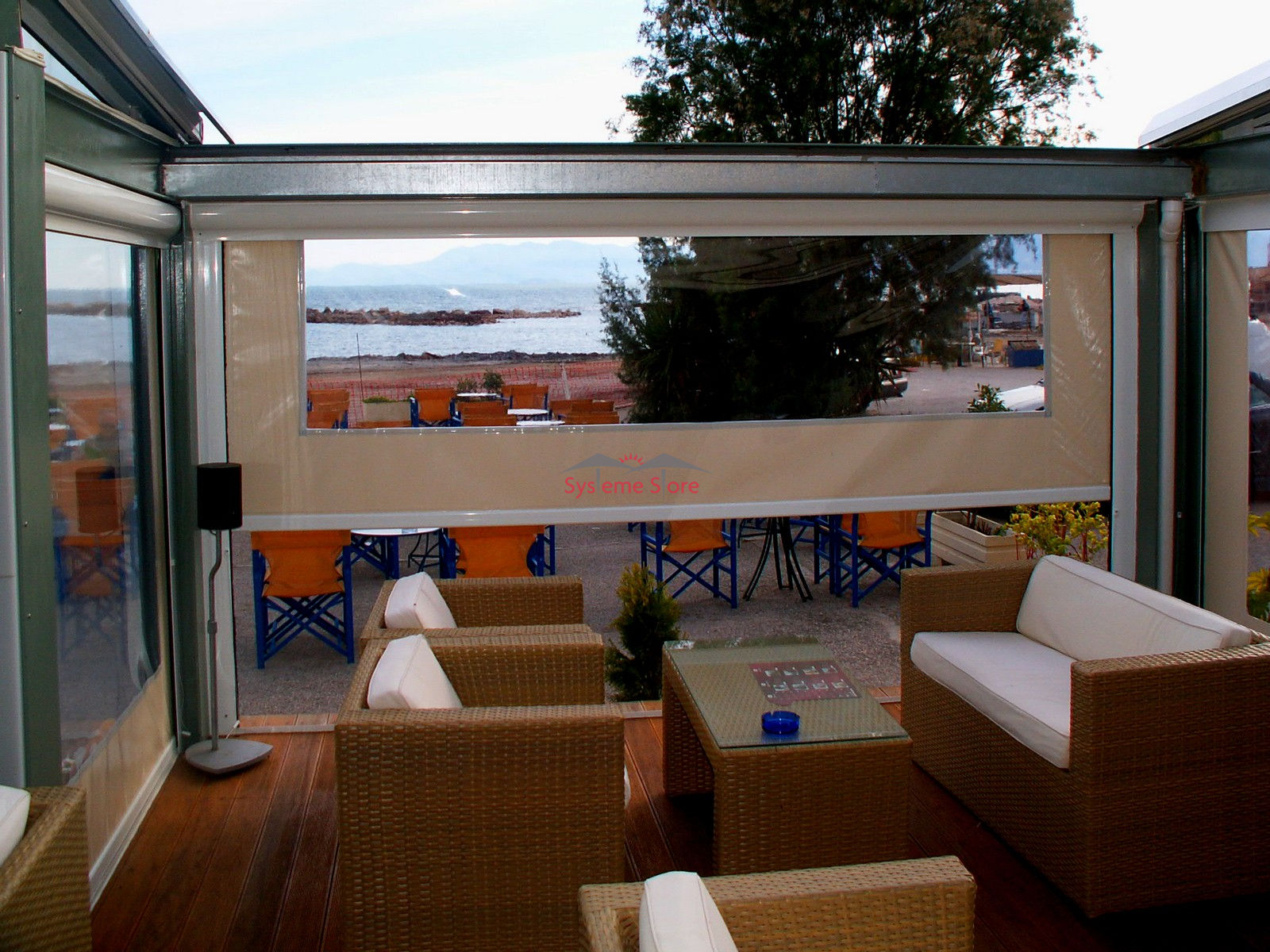 C'est un Store robuste avec une excellente finition technique ; la toile ou pvc glisse dans des coulisses latérales entrainant une fermeture totale et une résistance au vent grâce à un système zip .une fois la descente de la toile ou pvc est complète atteignant les bouts des coulisses inferieurs elle est bloqué alors par un système de blocage permettant une parfaite tension de la toile ou pvc.